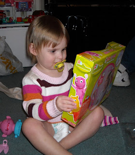 Annabelle is 2! Here are some pics from her Birthday. She wanted a Barney cake for her birthday so we ordered it from a local bakery. We couldn't talk her into a Barbie or Wizard of Oz cake, it had to be Barney, her favorite guy. It was a very good cake! She's crying in the photo with the cake because Justin told her not to take the balloons off the cake yet, every time he tells her "no" about ANYTHING she cries! Too funny.